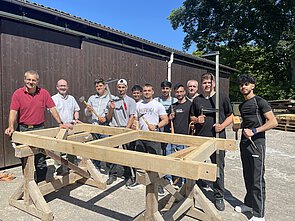 Die Klasse BES2 Technik (Berufseinstiegsschule) hat mit ihrem Lehrer Martin Schuldes für uns eine Fachwerk-Konstruktion vorgefertigt, die uns jetzt Steinrode zur Verfügung steht. Daran kann man versuchen, mit handgemachten Lehmbausteinen die Gefache passend auszumauern. Das Sägewerk Fehrensen hat das Holz dafür gespendet, das Fuhrgeschäft Grote brachte das Holz zur BBS. Harald Wegener brachte die Bauteile nach Steinrode. Wir danken allen ganz herzlich dafür!
